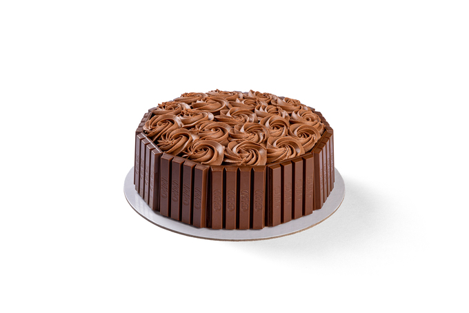 Chocolate cake surrounded by KitKat bars and topped with a mountain of chocolate ganache.